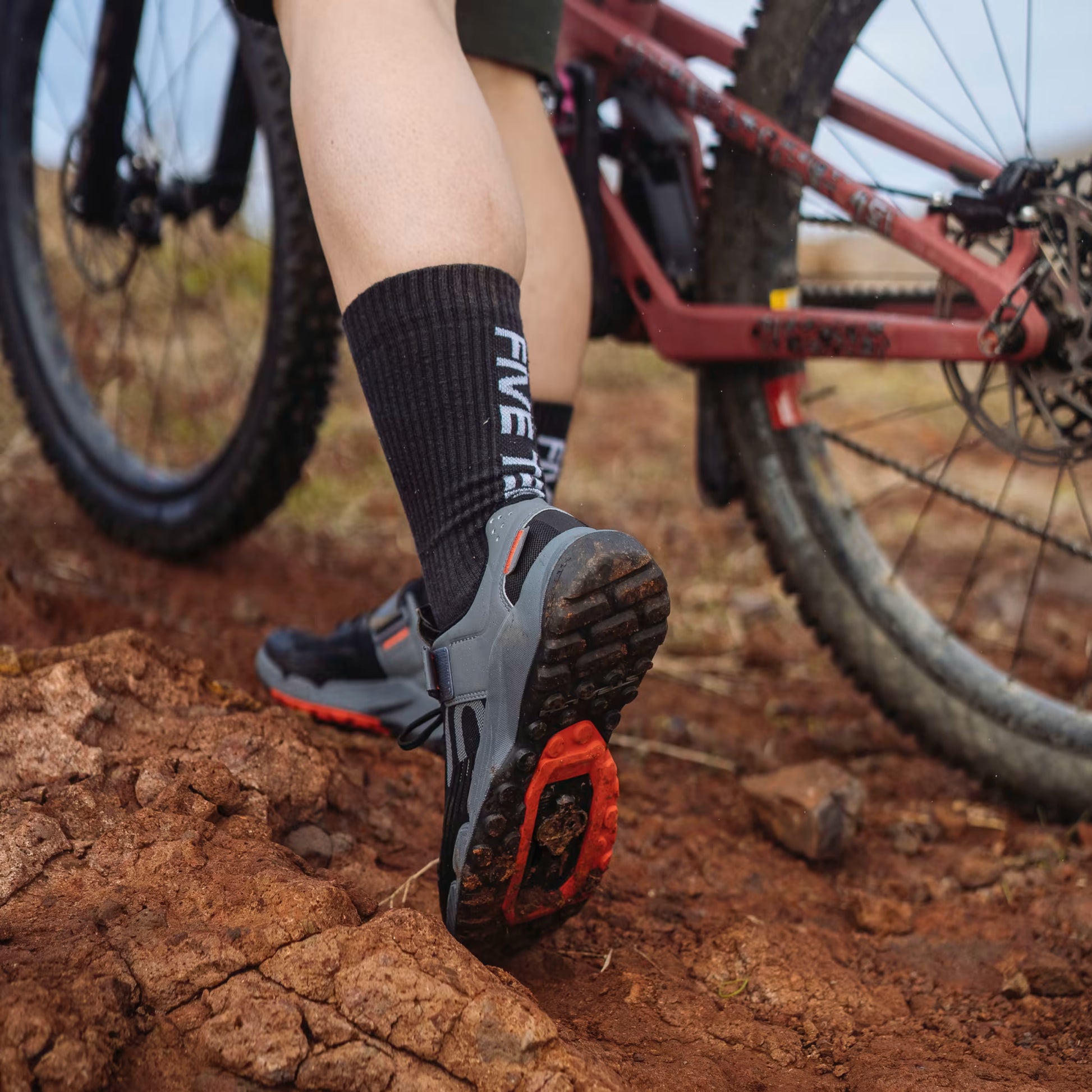Mit einer genoppten Außensohle und Stollen, die mit Automatikpedalen kompatibel sind, sorgt er für eine optimale Kraftübertragung. Der zusätzliche geriffelte Grip am Vorfuß und an der Ferse verbessert die Stabilität beim Gehen. Die EVA-Zwischensohle sorgt für die nötige Flexibilität beim Wandern und behält gleichzeitig die nötige Steifigkeit beim Treten bei.