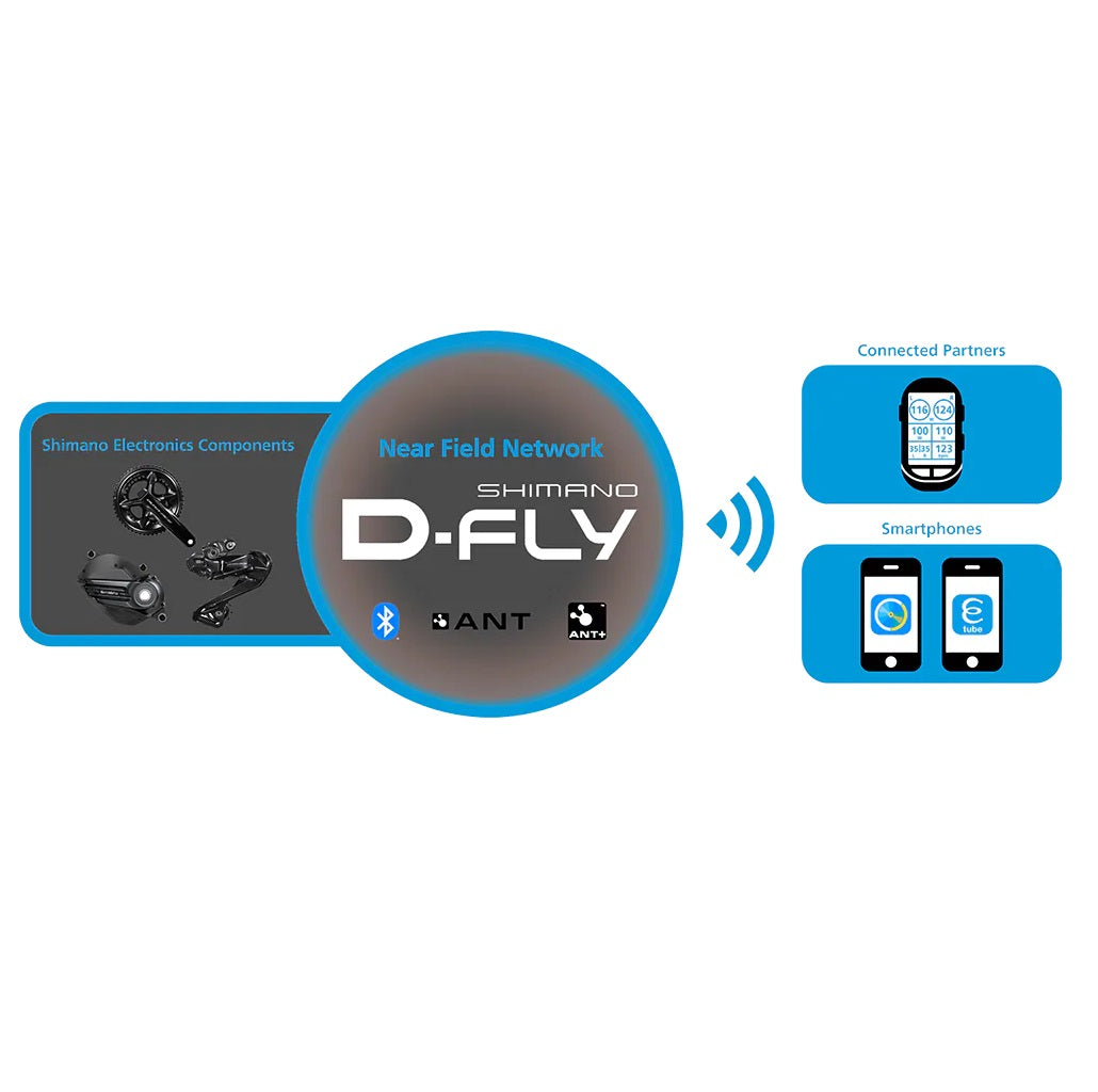 Shimano D-FLY stellt die Verbindung zwischen den Technologien der Komponenten und der Di2-Software her. D-Fly ermöglicht die Konnektivität zwischen Di2-Systemen und ANT+/Bluetooth®LE-kompatiblem Zubehör wie Fahrradcomputern/GPS und Beleuchtungen. Es bietet auch eine drahtlose Verbindung mit Shimanos E-TUBE PROJECT Cyclist für Smartphones, die es ermöglicht, die Konfiguration des Schalthebels anzupassen, nach Firmware-Updates zu suchen und Komponentenfehler zu beheben.