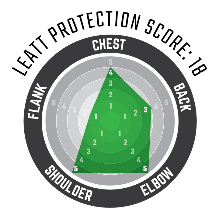 Homologuée selon les normes CE, la veste assure une protection certifiée : torse EN1621-3 Level 1, dos EN1621-2 Level 1, épaules et coudes EN1621-1 Level 1. Le score de protection Leatt atteint 18 points, confirmant un niveau élevé d’absorption des chocs.