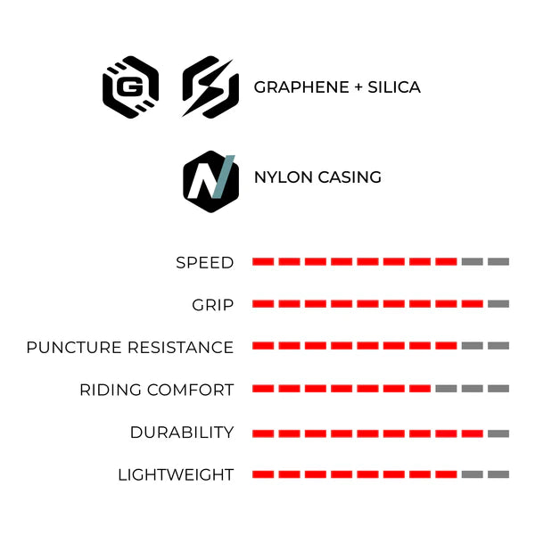 Sein modernisiertes Profil verfügt über eine glatte Mitte für mehr Geschwindigkeit, ein überarbeitetes Fischgrätenmuster für besseren Grip und die charakteristische Gitterstruktur für mehr Kontrolle in Kurven. Die neue Mischung Graphene + Silica bietet einen hervorragenden Kompromiss zwischen Langlebigkeit, Pannenschutz, Grip und Leistung für einen zuverlässigen und intensiven Gebrauch.
