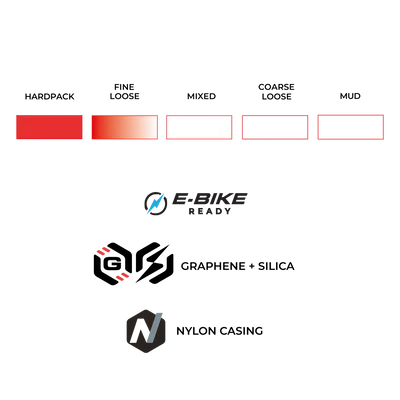 Die Mischung Graphene + Silica verbessert den Grip, die Geschwindigkeit und die Haltbarkeit. Das Ergebnis: 20 % mehr Geschwindigkeit, 8 % mehr Grip und 44 % mehr Pannenschutz. Der Terreno XC Race verkörpert die pure Leistung für diejenigen, die den ersten Platz anstreben.