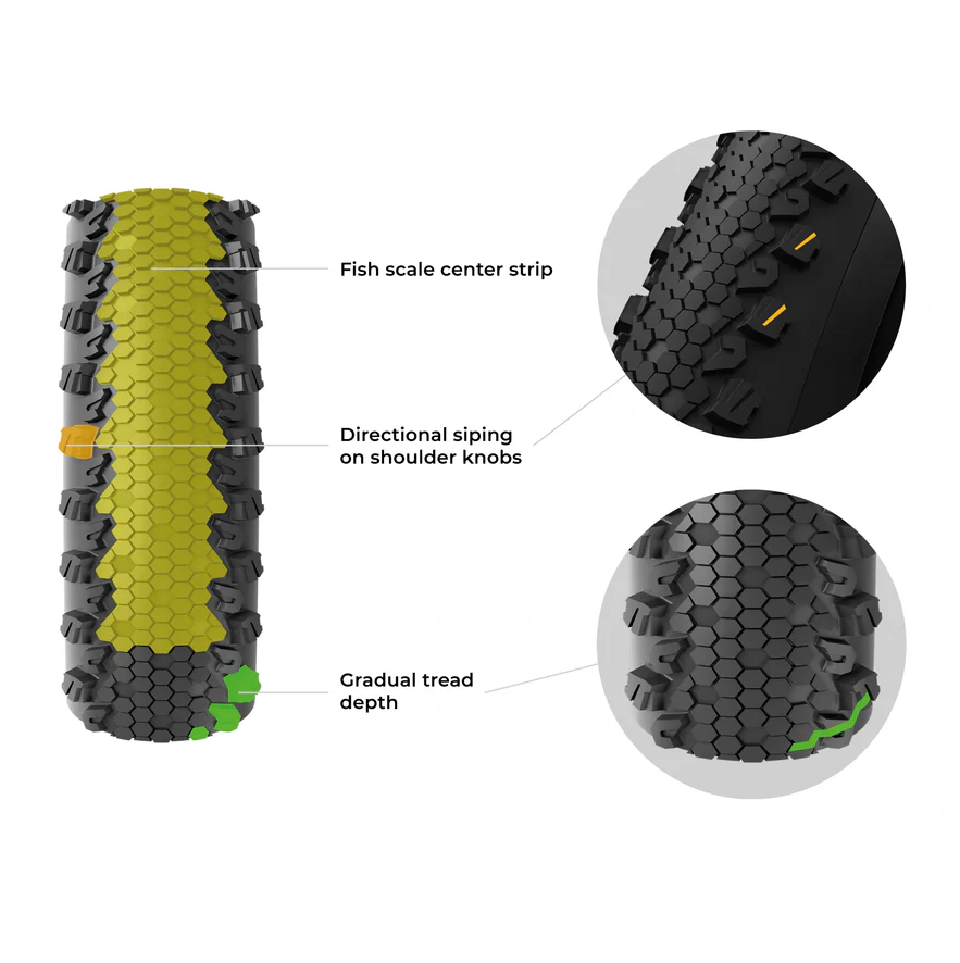 Sein zentrales "Fischschuppen"-Laufflächenprofil bietet einen geringen Rollwiderstand, ideal für schnelle Geraden, während es in Kurven dank eines fließenden Übergangs zu den verstärkten Seitenstollen effektives Bremsen und Grip gewährleistet. Seine 60 TPI Nylonkarkasse absorbiert Stöße und begrenzt Durchstiche, ohne dabei auf Flexibilität oder Effizienz zu verzichten.