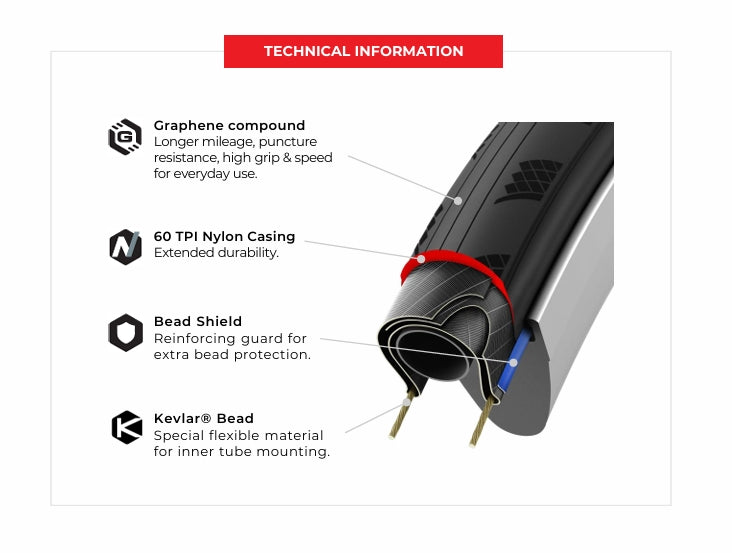 Grâce au composé Graphene, il assure une adhérence optimale et une durabilité accrue. La carcasse 60 TPI renforce la résistance tout en conservant un bon rendement. Idéal pour un usage intensif au quotidien.