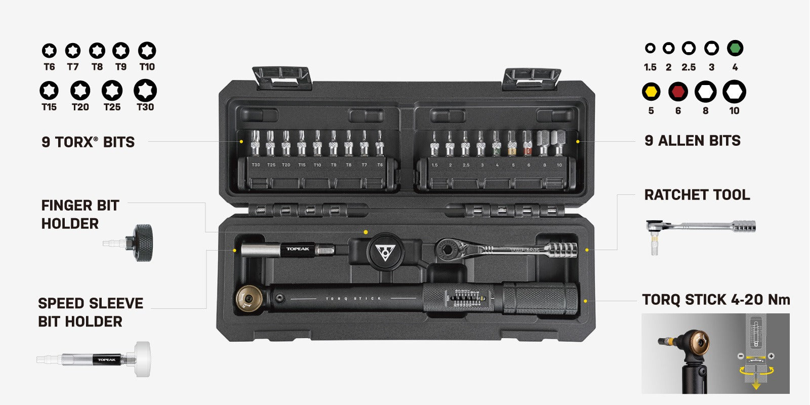 Der Torq TOPEAK STICK PRO Drehmomentschlüssel, ideal für eine präzise Fahrradmontage, vereint Innovation und Gründlichkeit, um den Anforderungen von Enthusiasten und Profis gerecht zu werden.